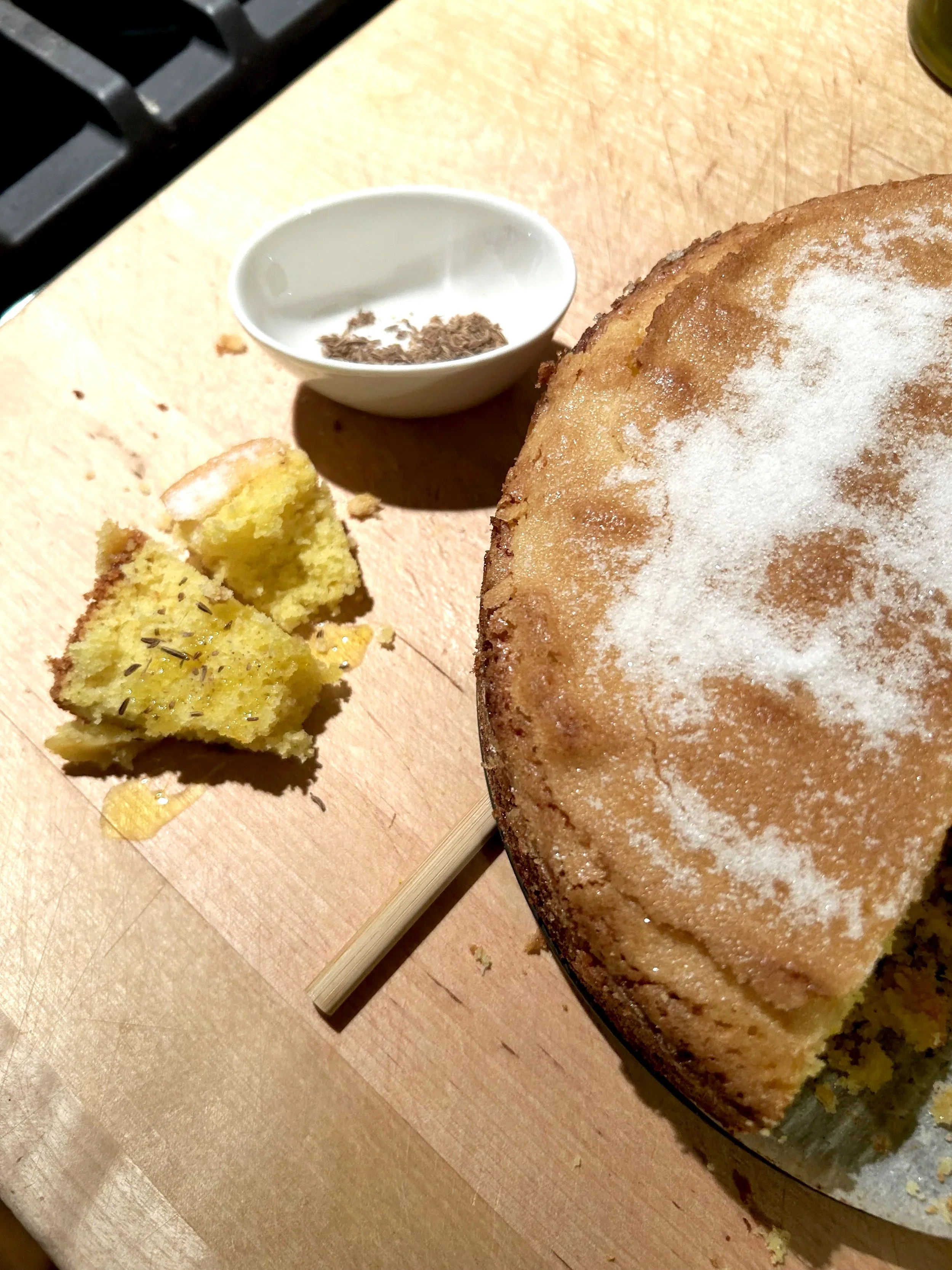 ~This cake holds terrifically for days on the counter covered with an inverted glass bowl or cake stand cover. Serve as is or…. drizzle olive oil on a little share plate and sprinkle the olive oil with slightly crushed caraway or coriander seeds. Place your slice of cake in center of olive oil puddle magic. It’s also nice with a bit of crème fraiche or whipped cream to the side. And don’t shy away from slicing a piece like toast and toasting it! Drizzle some olive oil on your cake-toast, with maybe even a little more orange zest and a couple of kernels of salt! Your imagination is your only limit. -Laurel